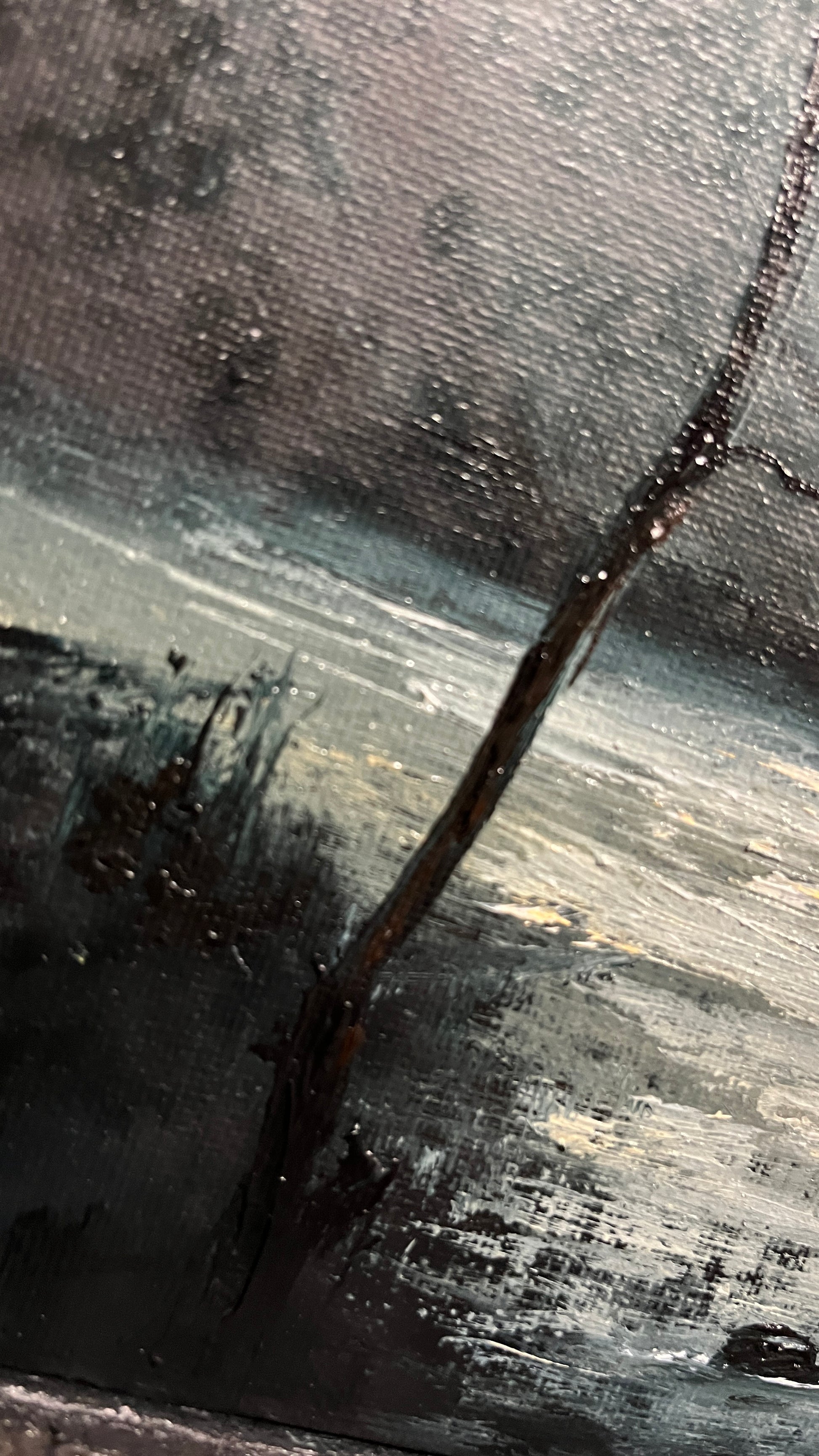 Two silent trees stand guard under the moon in Keepers of the Silence. This original gothic oil painting (24 × 30 cm / 9.4 × 12 in) captures the quiet majesty of night: the moon illuminates the waters below, turning solitude into reverence. With deep greens, blacks, and silver reflections, the scene evokes the timeless poetry of Dark Academia.