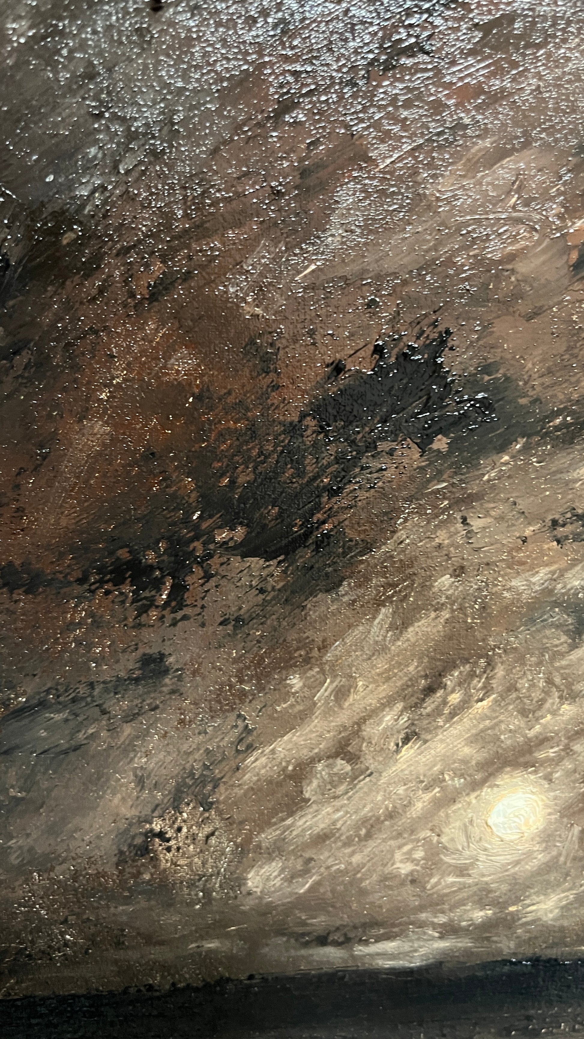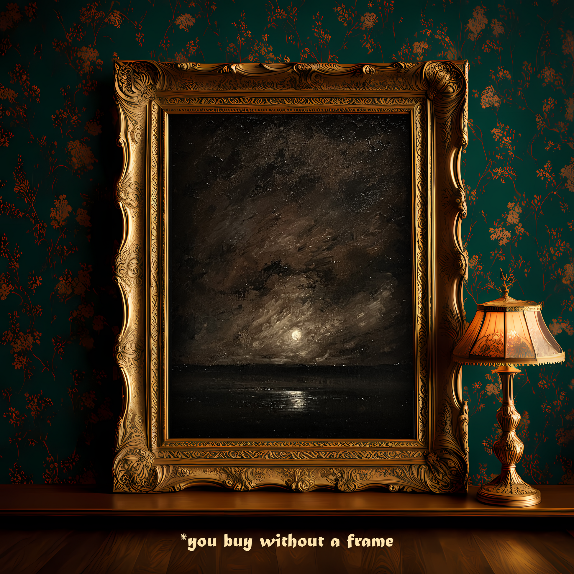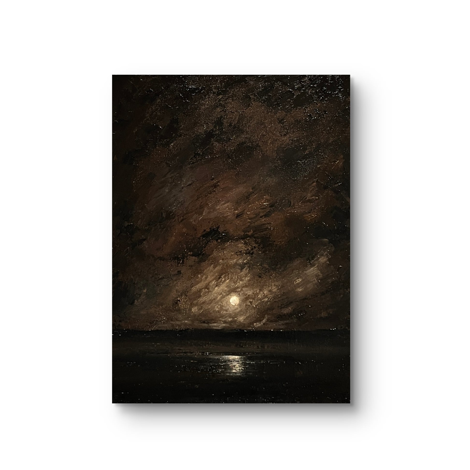 This original oil painting by Khalin Mykhailo shows a full moon over a peaceful night landscape. Made in 2025 in the European Union, the 12x16 inch artwork combines styles like surrealism and realism. It captures the beauty of nature and the sea with rich colors and fine details. Signed by the artist and unframed, this unique piece brings a calm, vintage mood to any space.