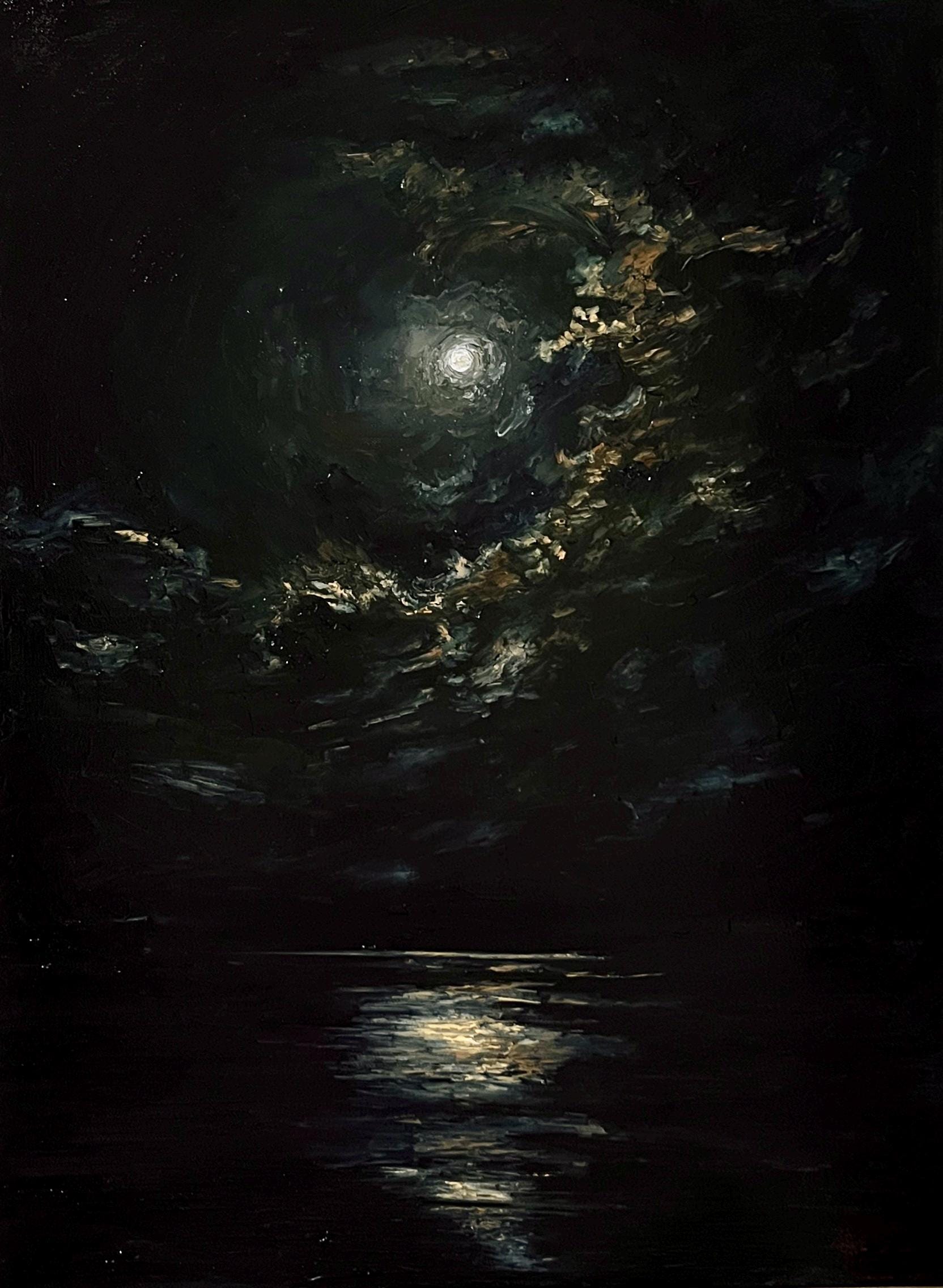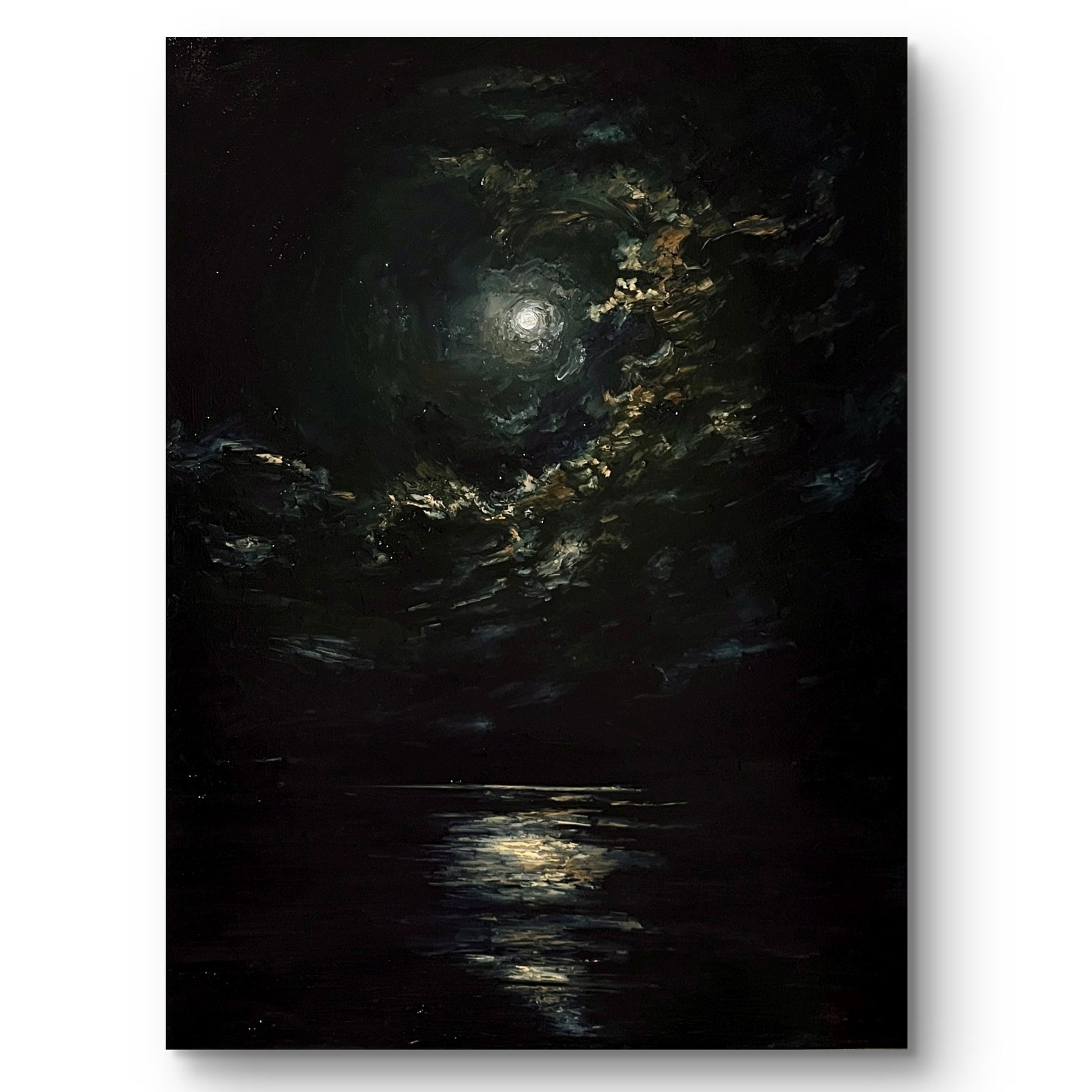 This 32x24 inch artwork invites you into the mysterious ambiance of a moonlit night, where glowing moonlight dances on restless clouds and gently reflects on water, creating an evocative and haunting scene. Hand-painted with textured brushstrokes, it brings a moody atmosphere to life, making it ideal for Gothic, Dark Academia, or Victorian-inspired interiors. Unframed and ready for your choice of framing, this piece offers a profound artistic expression of night’s stillness and intrigue.