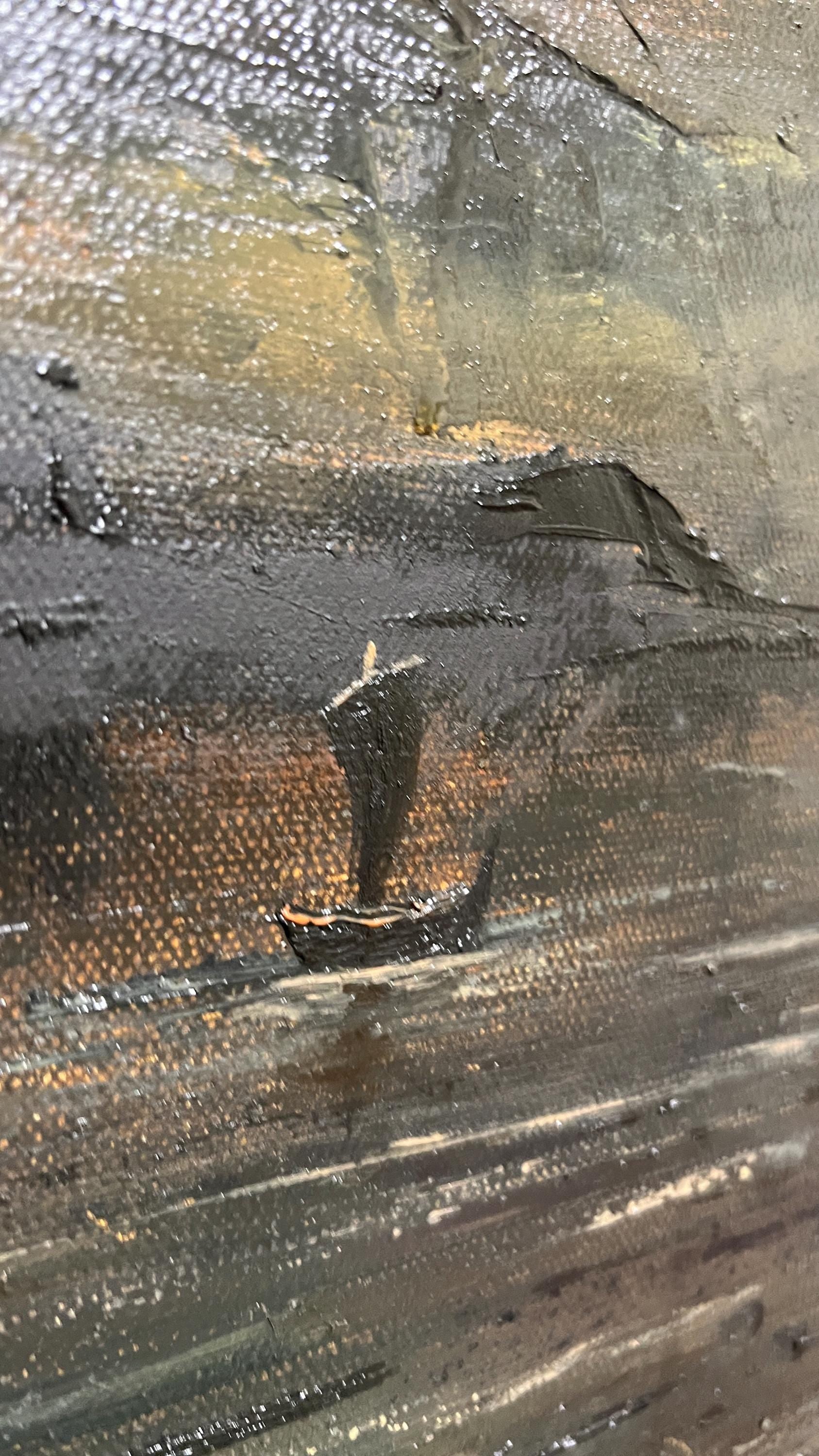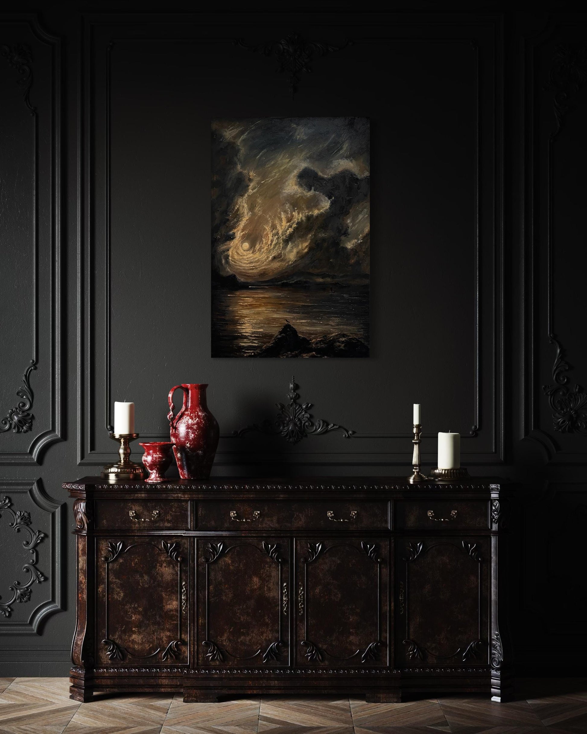 Experience the depth and mystery of this original oil painting by Mykhailo Khalin. Measuring 80x120 cm, it features a dark sky swirling above reflective ocean waters, blending serenity with powerful emotion. Hand-painted with rich textures and signed by the artist, this large seascape is ideal for collectors and lovers of atmospheric, moody art.