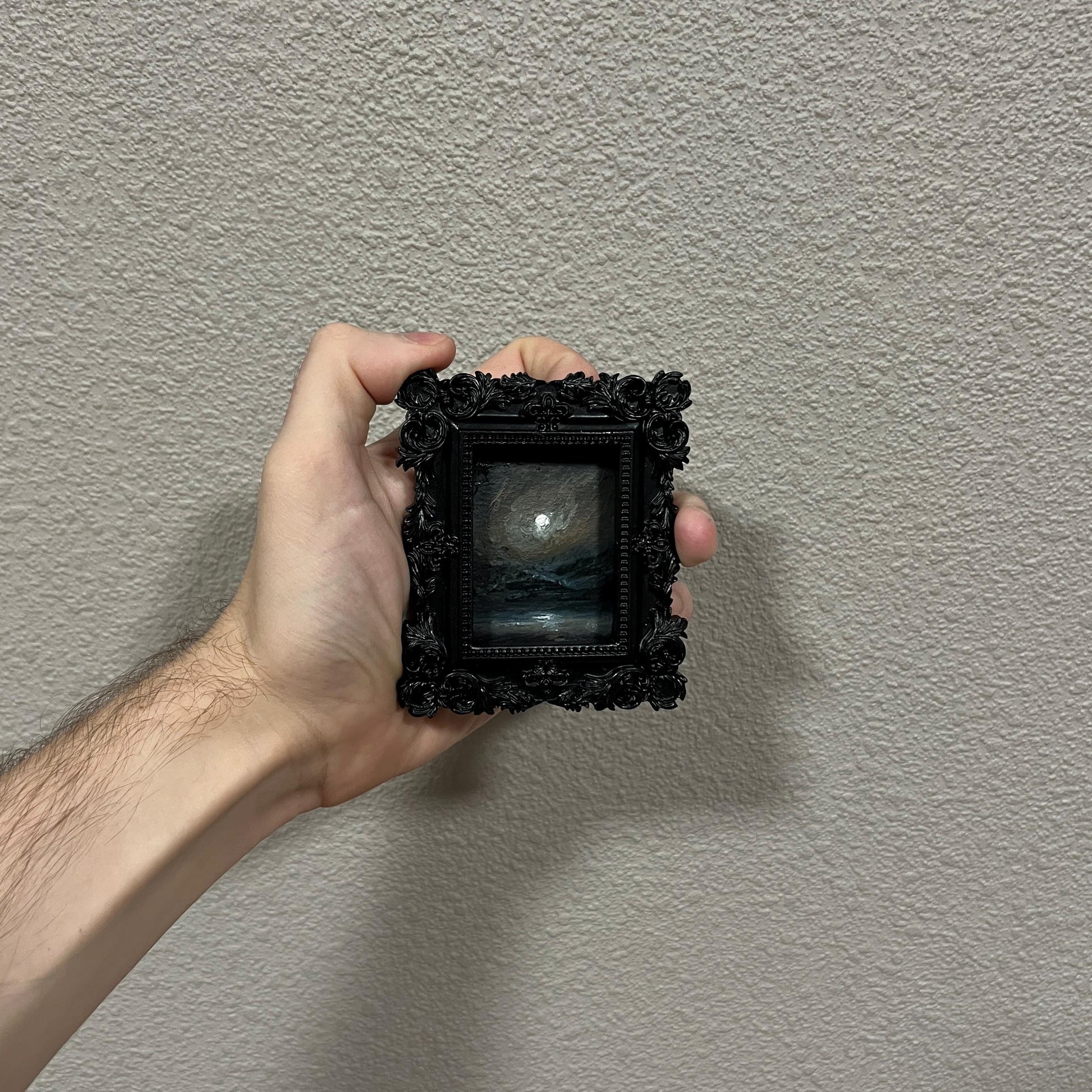 This original miniature oil painting, Echoes of Dusk, features a moonlit scene framed in a black gothic frame. Handmade and unique, it captures a quiet moment between light and shadow. Perfect for new collectors, this piece brings a timeless gothic touch to any space. Free shipping included.