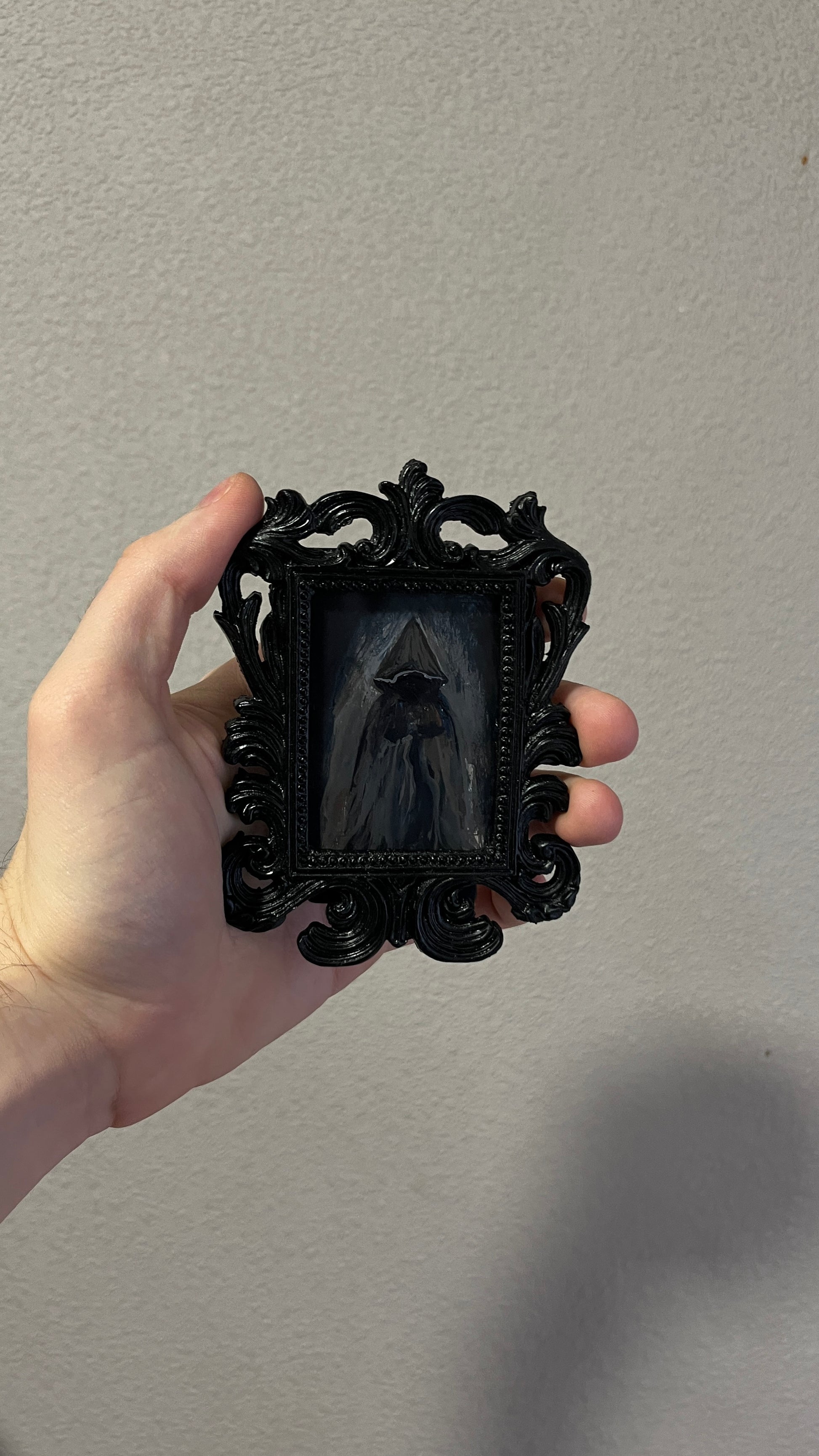 The muted palette, thick expressive strokes, and the ornate black baroque frame turn this piece into an intimate gothic relic — something you’d expect to find in a dusty library drawer or inside an antique curiosity cabinet.