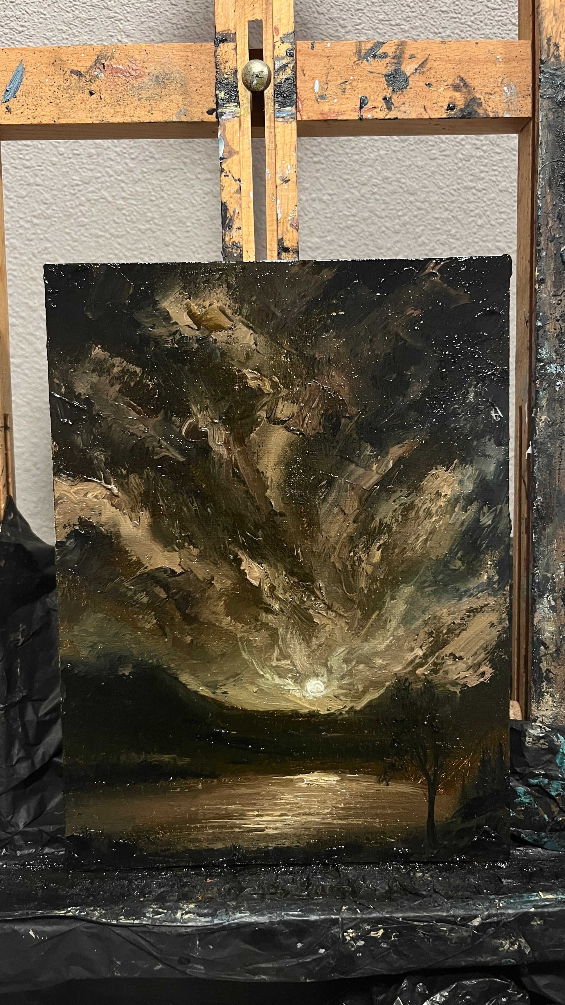 The heavens ignite in Infernal Sky, an original oil painting (18 × 24 cm / 7 × 9.4 in). Swirling clouds erupt with bronze and black, illuminated by the pale moon that reflects upon the water below. This painting captures the raw intensity of gothic romanticism, where night becomes a living storm of light and shadow.
