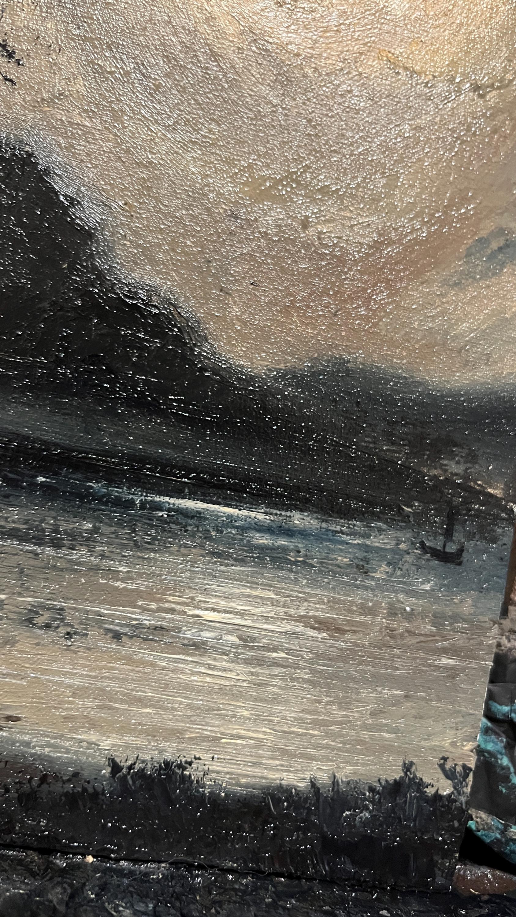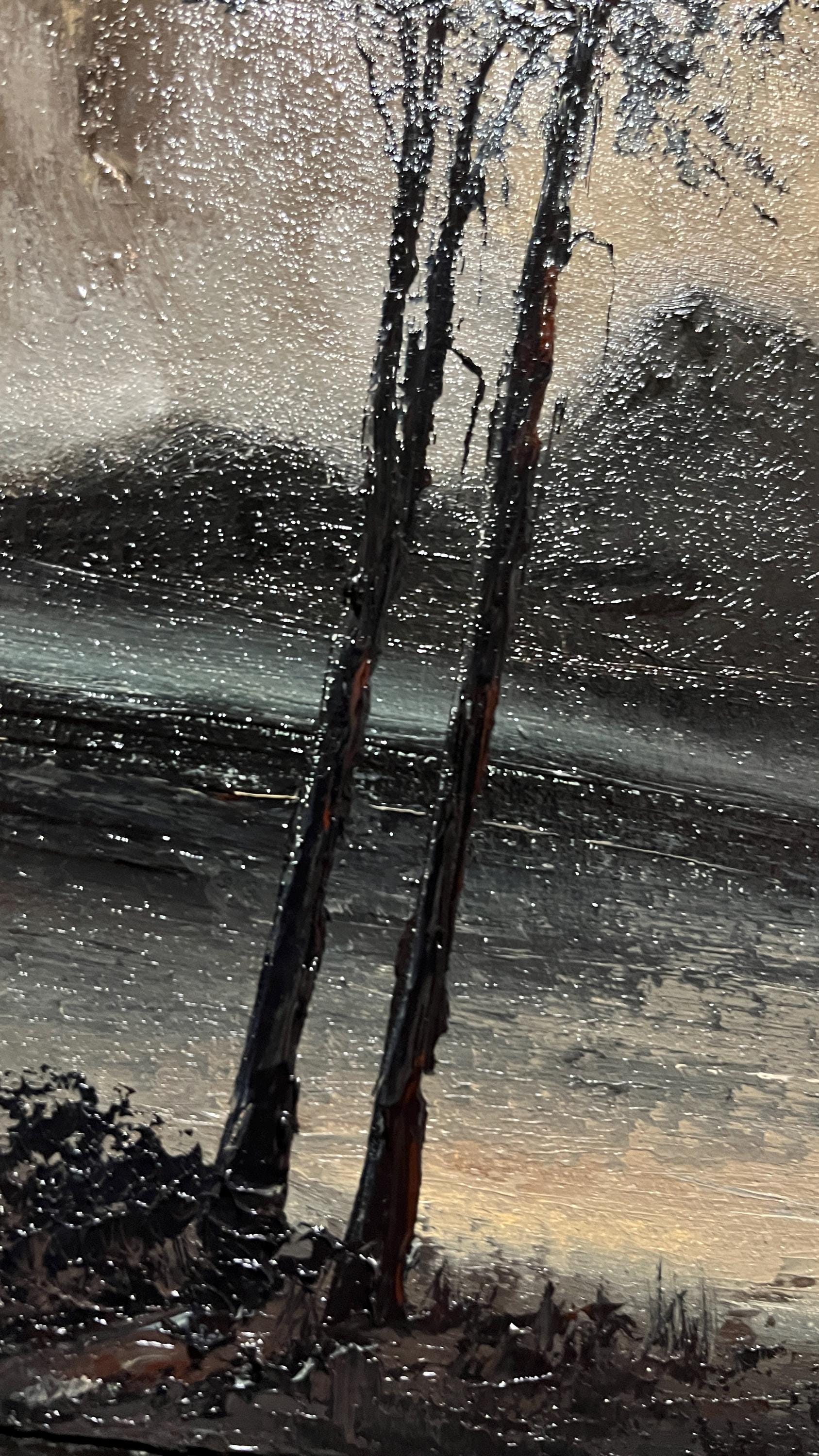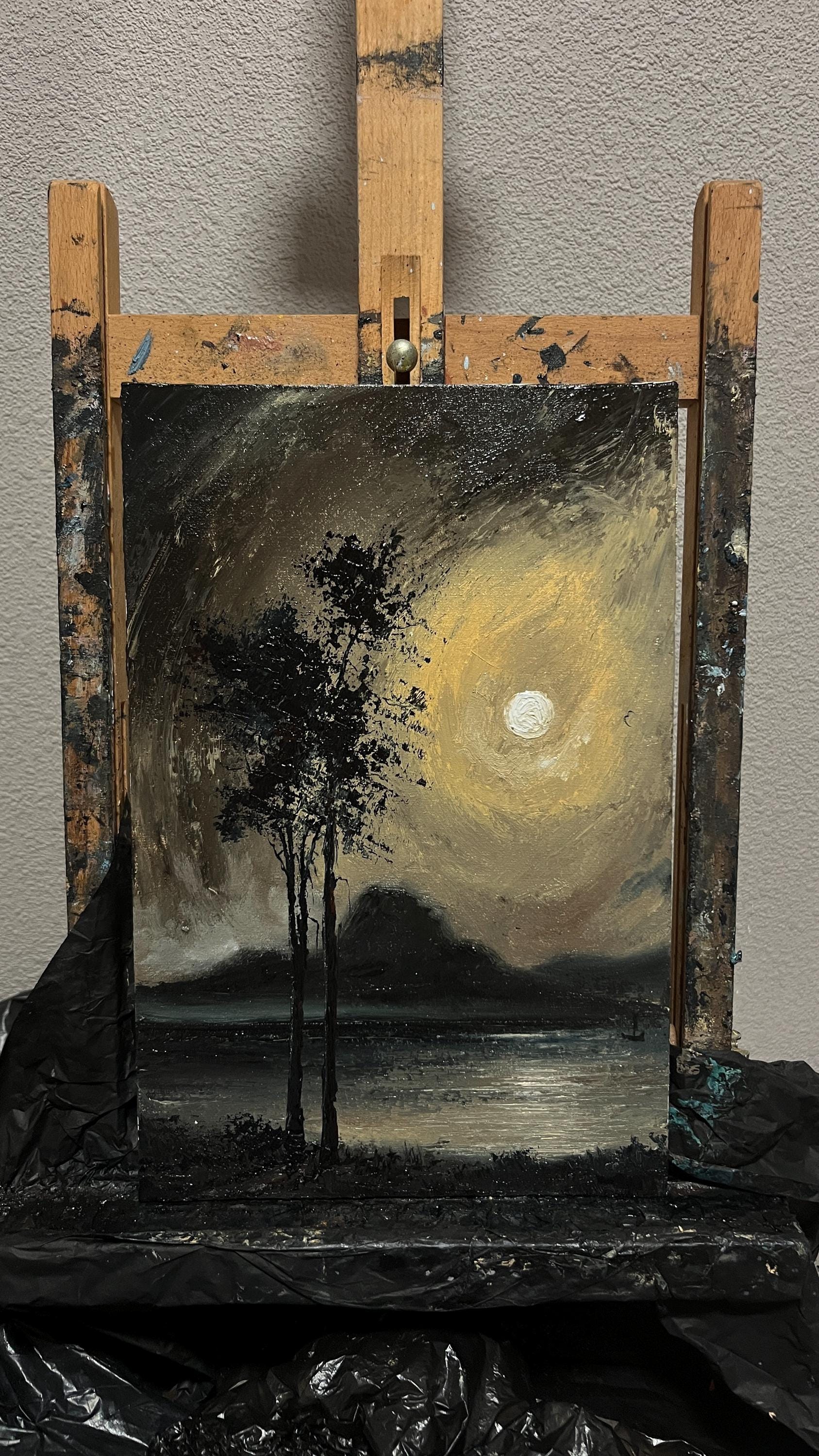 Lunar Reverie is an original oil painting showing two tall trees under a glowing moon, with a boat drifting on calm waters and mountains in the background. Measuring 20 × 30 cm (8 × 12 in), its rich textures and deep tones create a peaceful, gothic atmosphere. This piece offers more presence than smaller works, making it a perfect centerpiece for those growing their Dark Academia or gothic art collection.