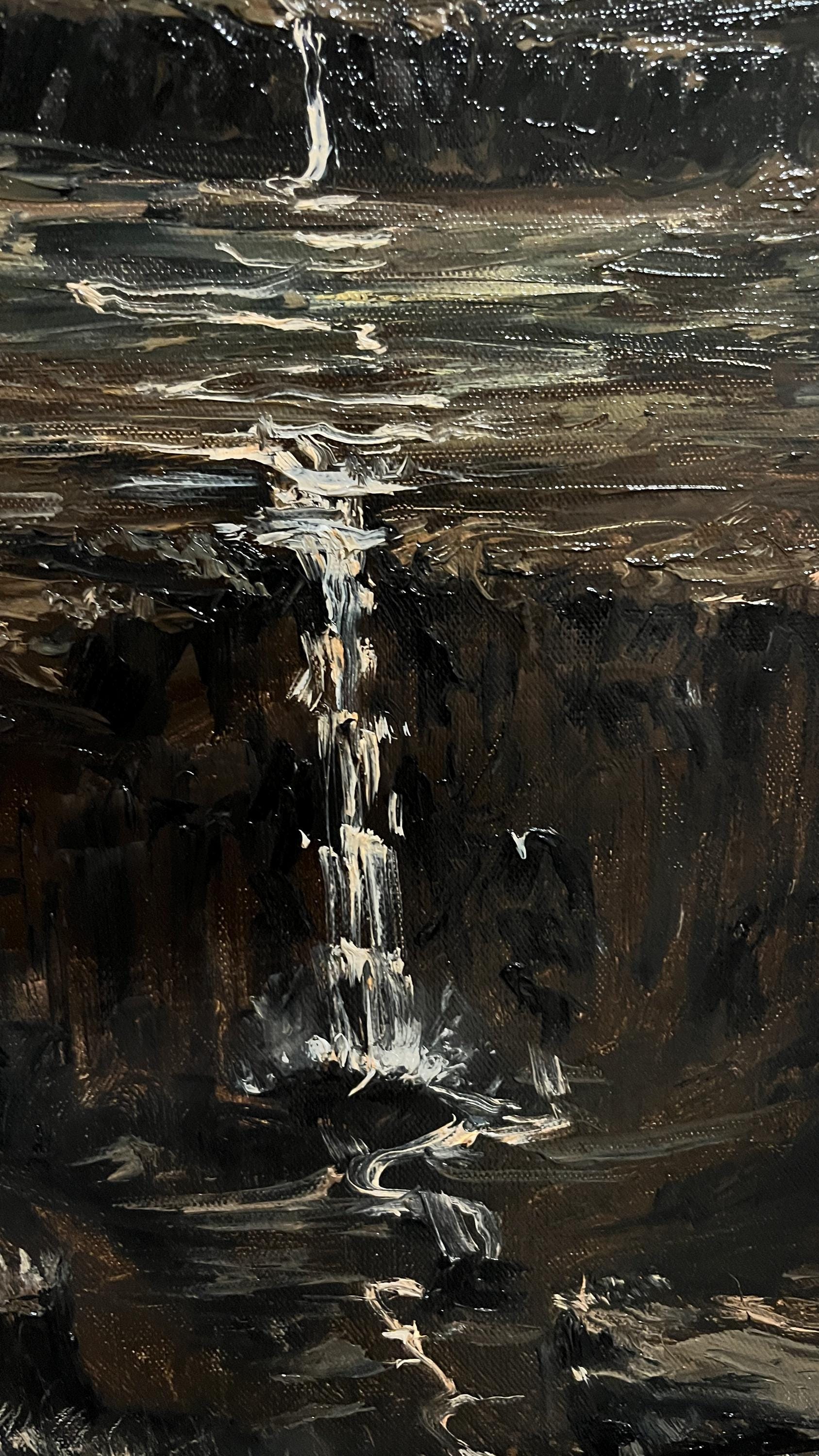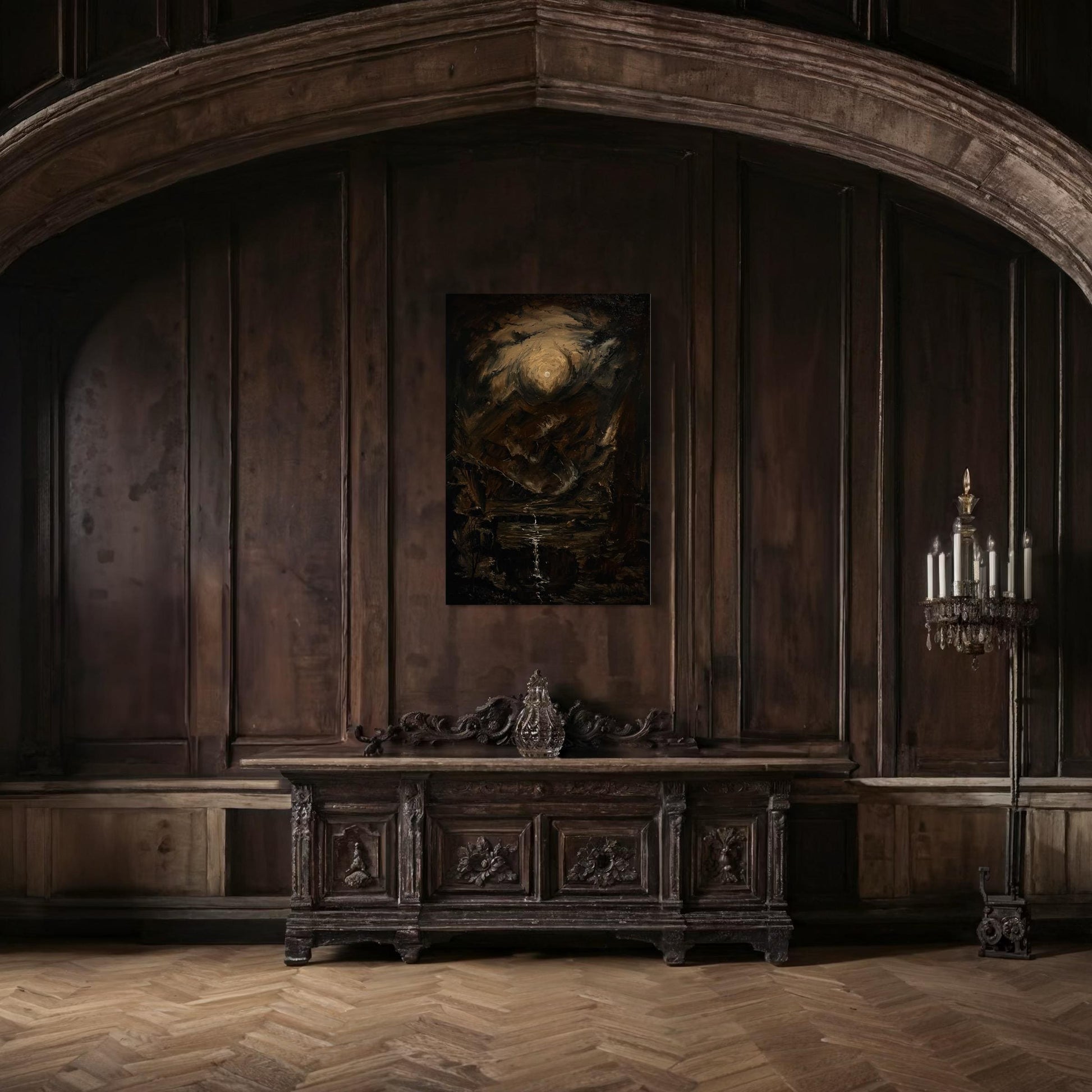 This made-to-order 32x48 inch oil painting features a moonlit valley with dark mountains, a reflective pool, and a mysterious waterfall. Hand-painted on quality canvas, it adds Gothic elegance and a moody atmosphere to any room. Perfect for fans of dark, fantasy landscapes seeking a unique, striking piece.