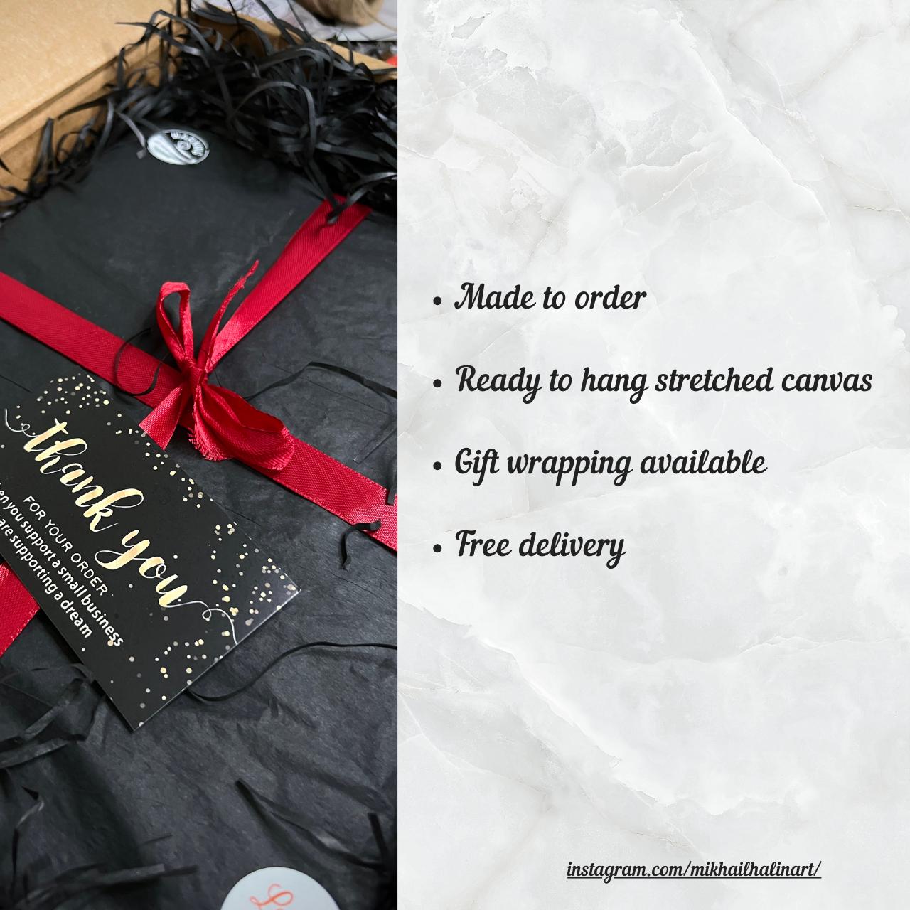 I carefully pack our paintings to ensure they arrive in perfect condition. Each painting is carefully wrapped in bubble wrap and packed in a strong cardboard box.