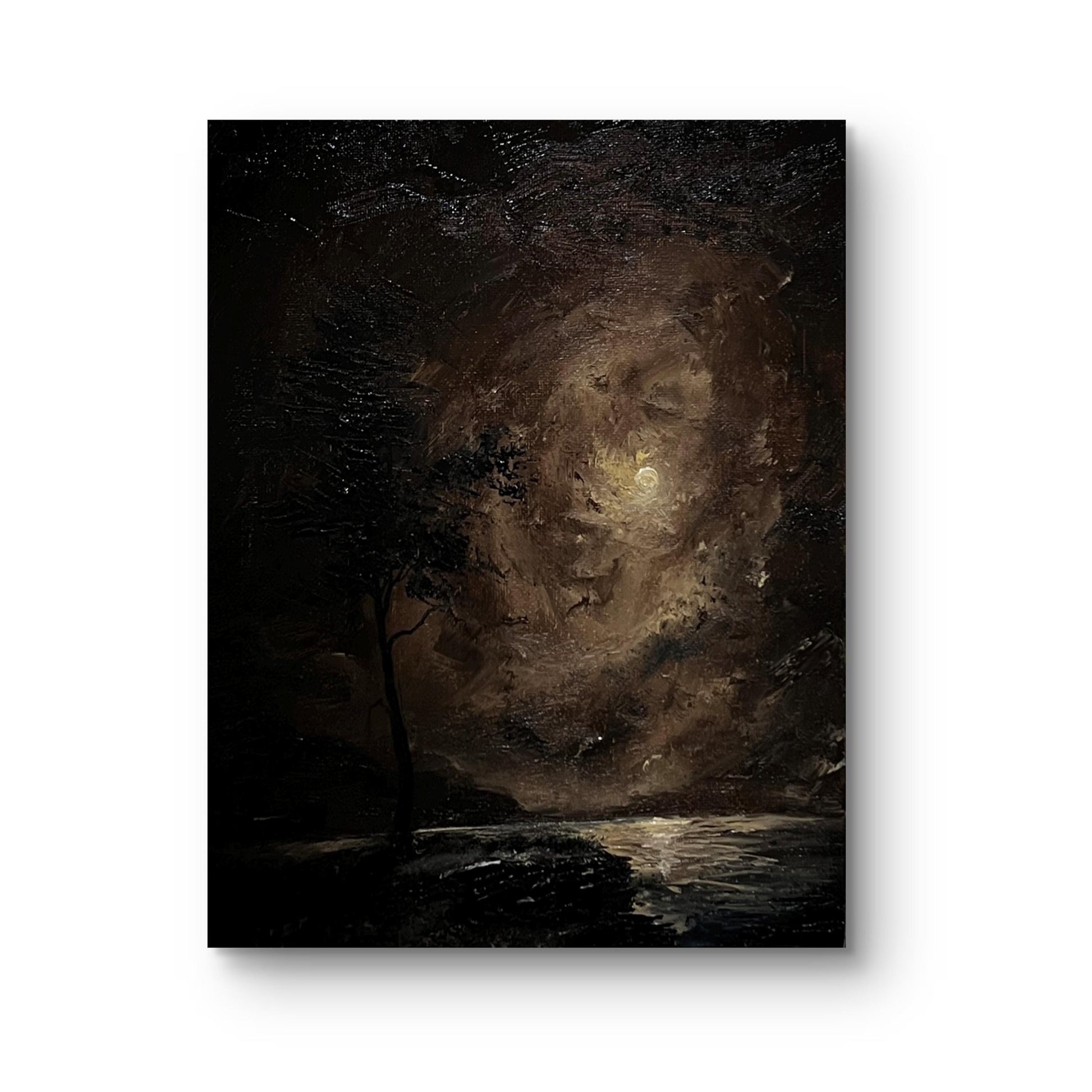 Mystic Moonlit Night – Dark Gothic Landscape Oil Painting, 24x30 cm, Mysterious Nocturnal Artwork, Haunted Forest Scene, Original Wall Art