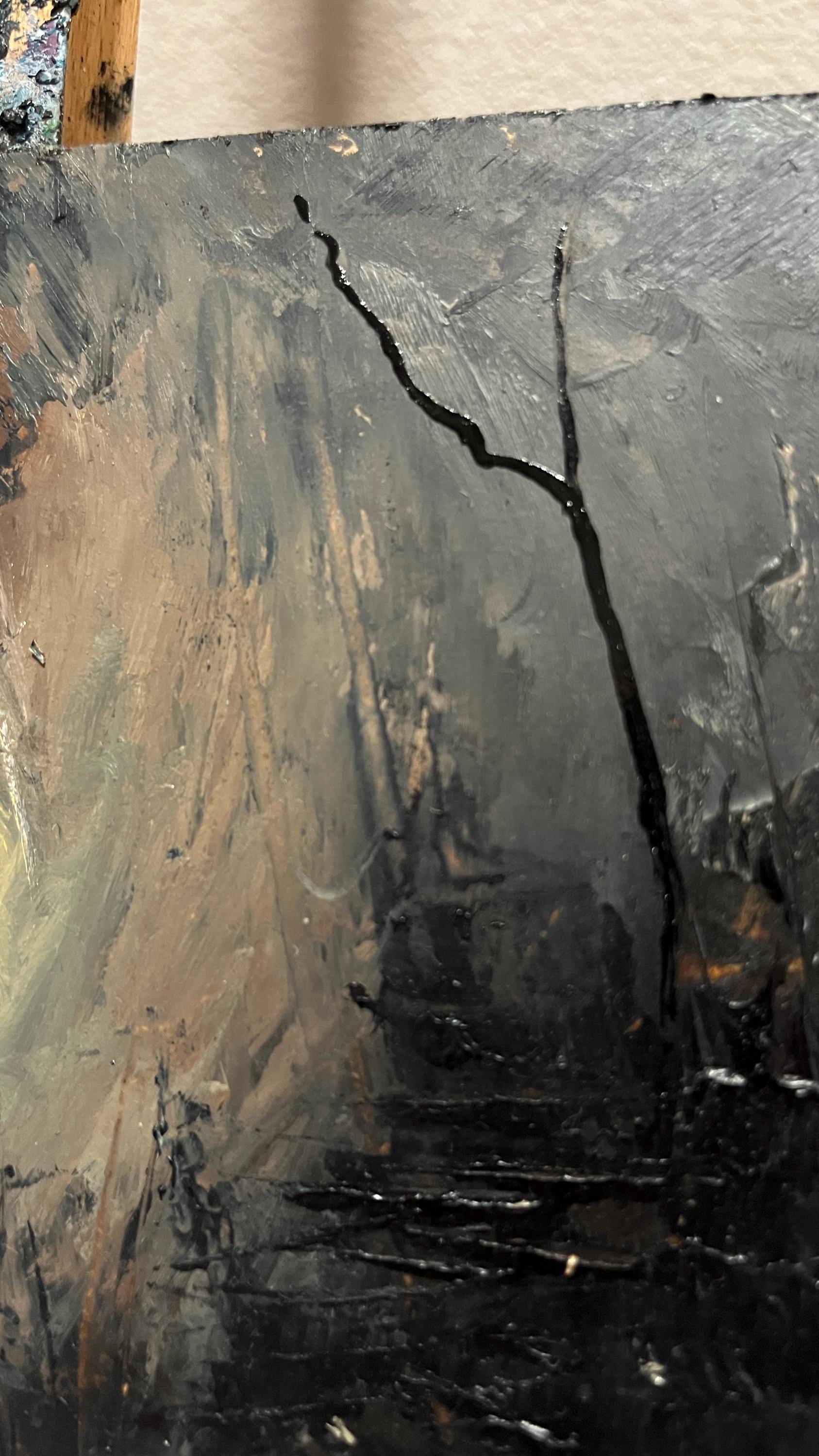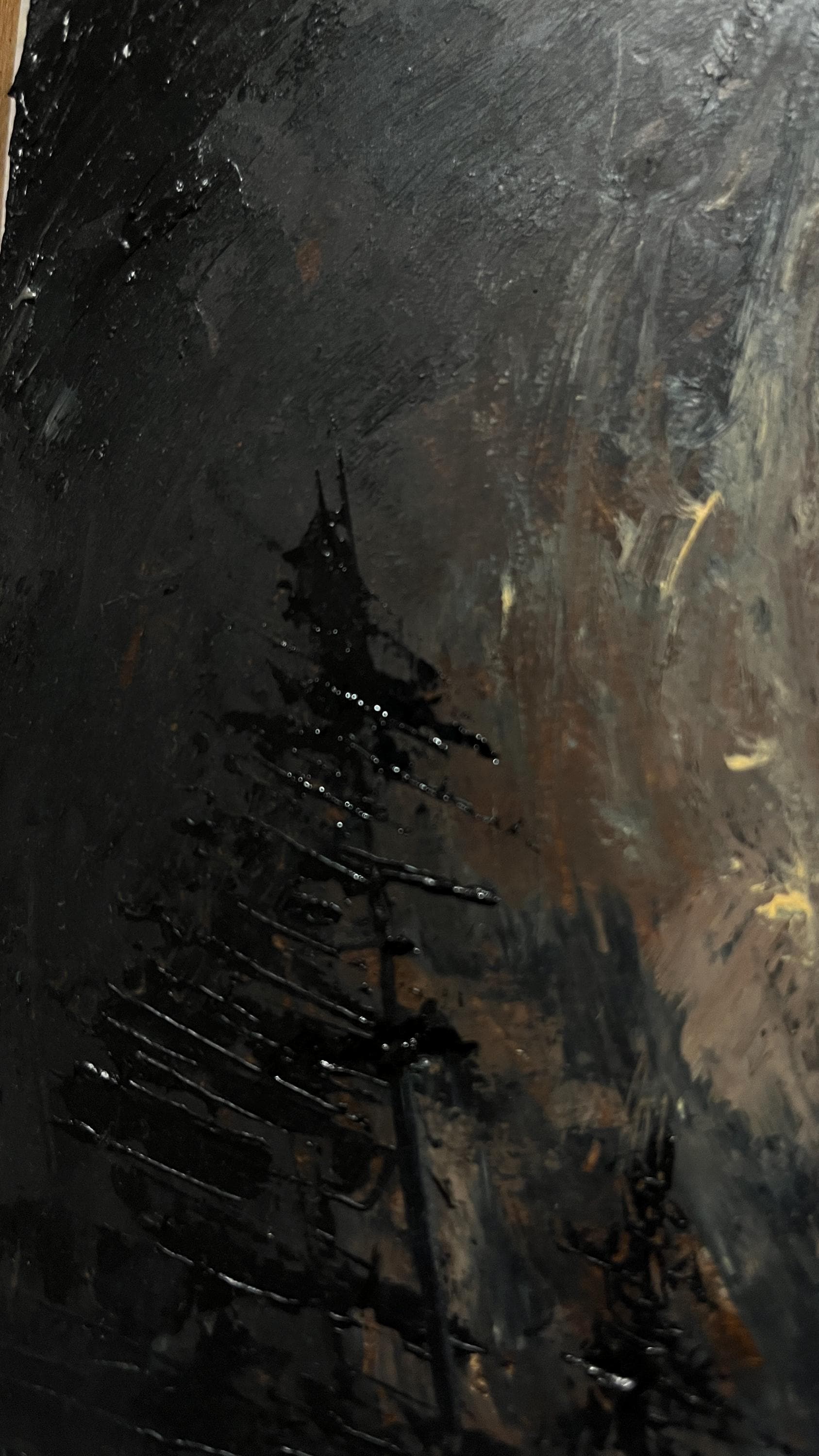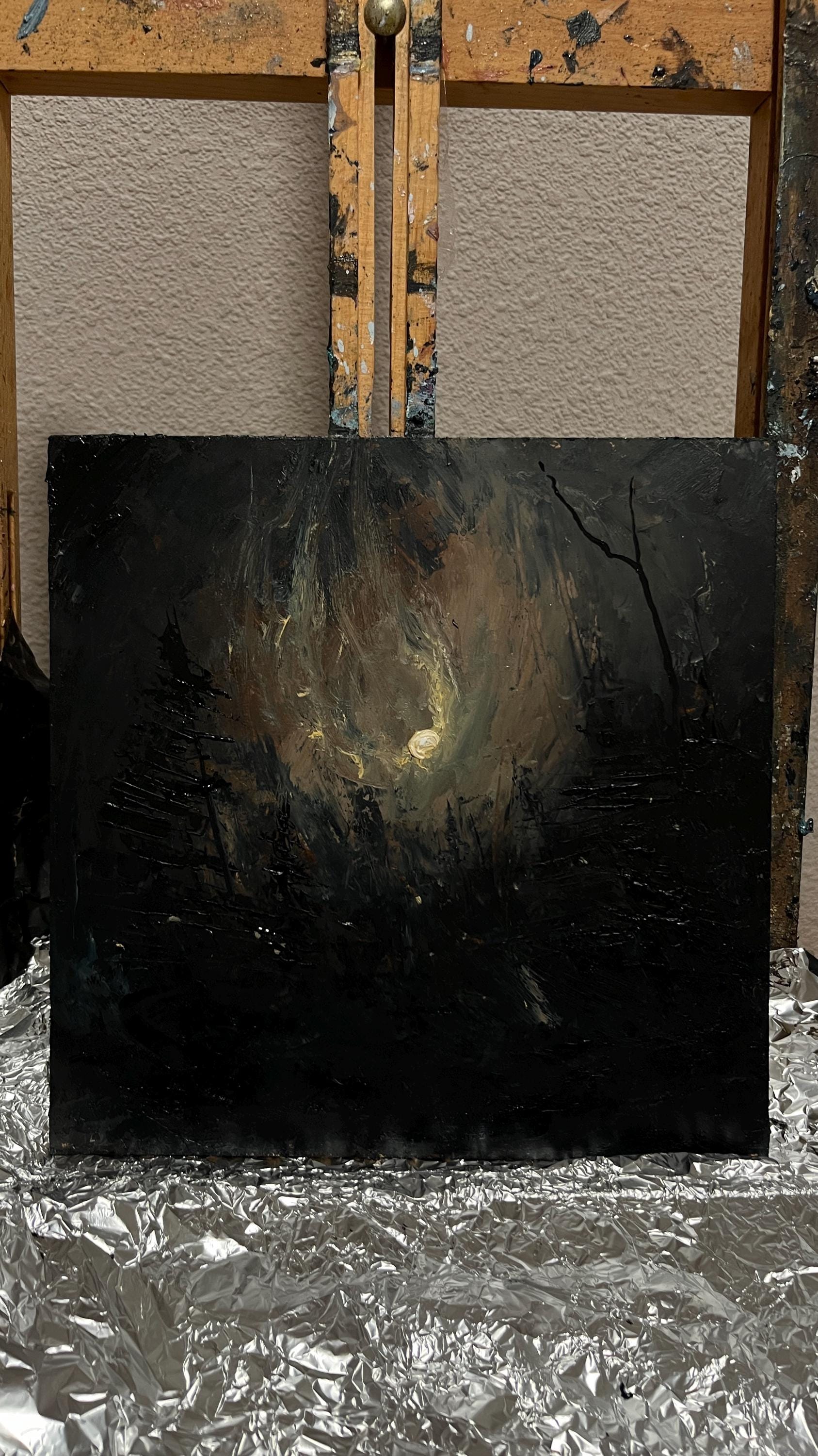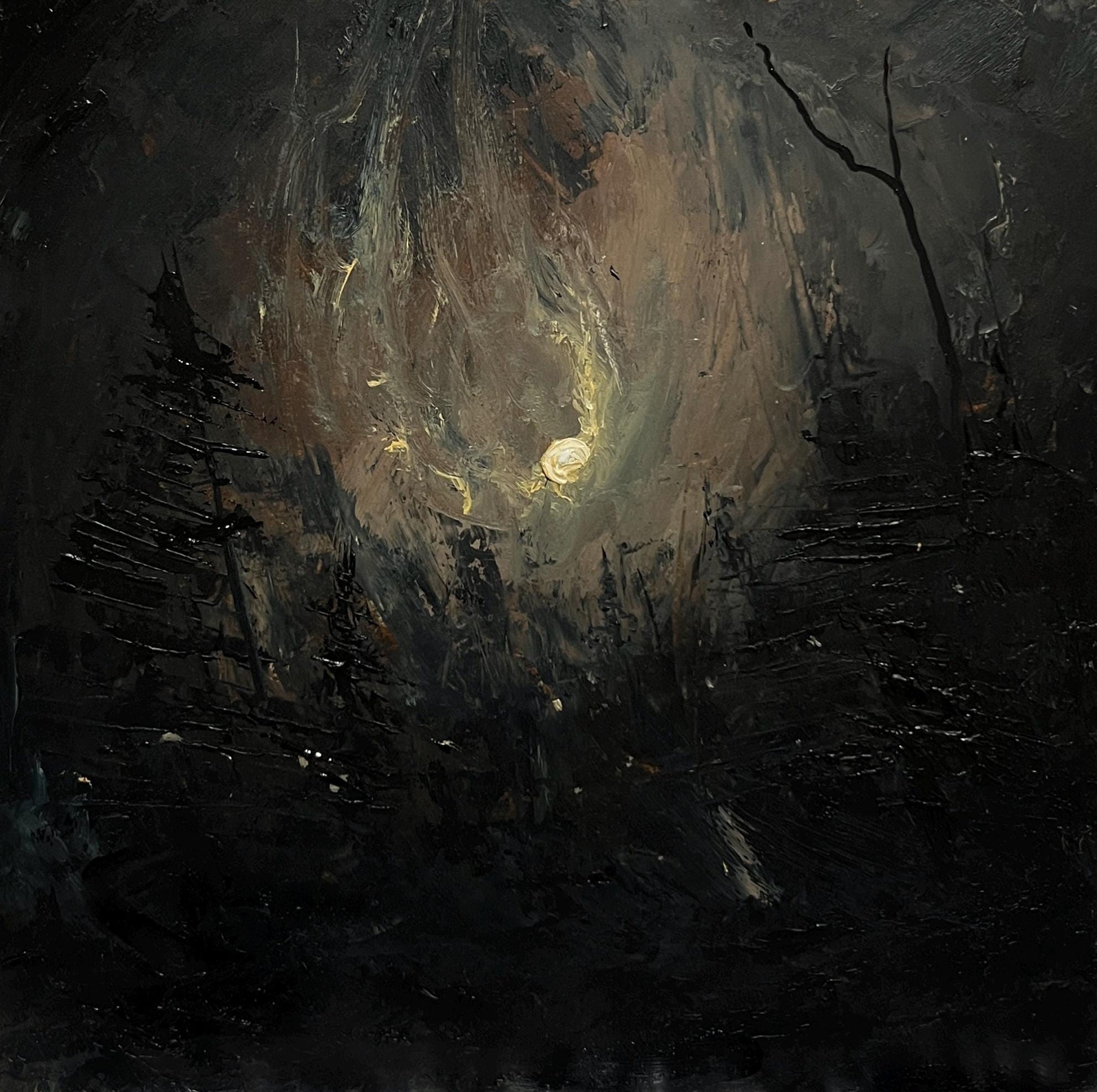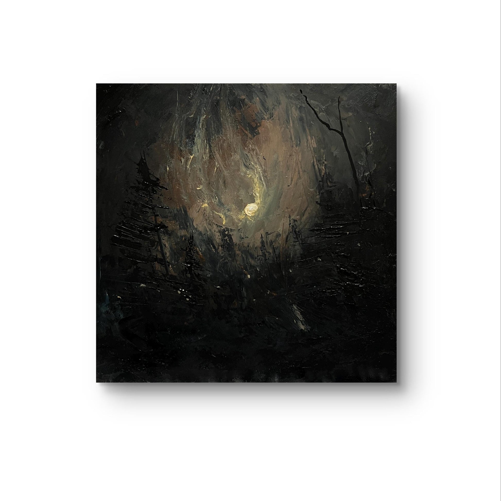 Omen of the Hollow is a 20x20 cm original oil painting capturing a glowing moonlight scene in a dark forest. Its textured strokes and gothic colors create a mysterious, intimate atmosphere. This piece is perfect for collectors starting to expand their Dark Academia collection with a meaningful, standout artwork.