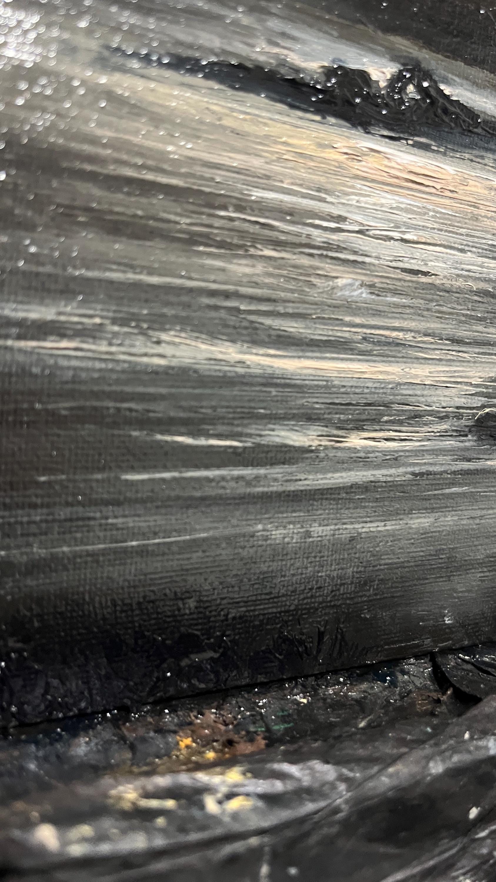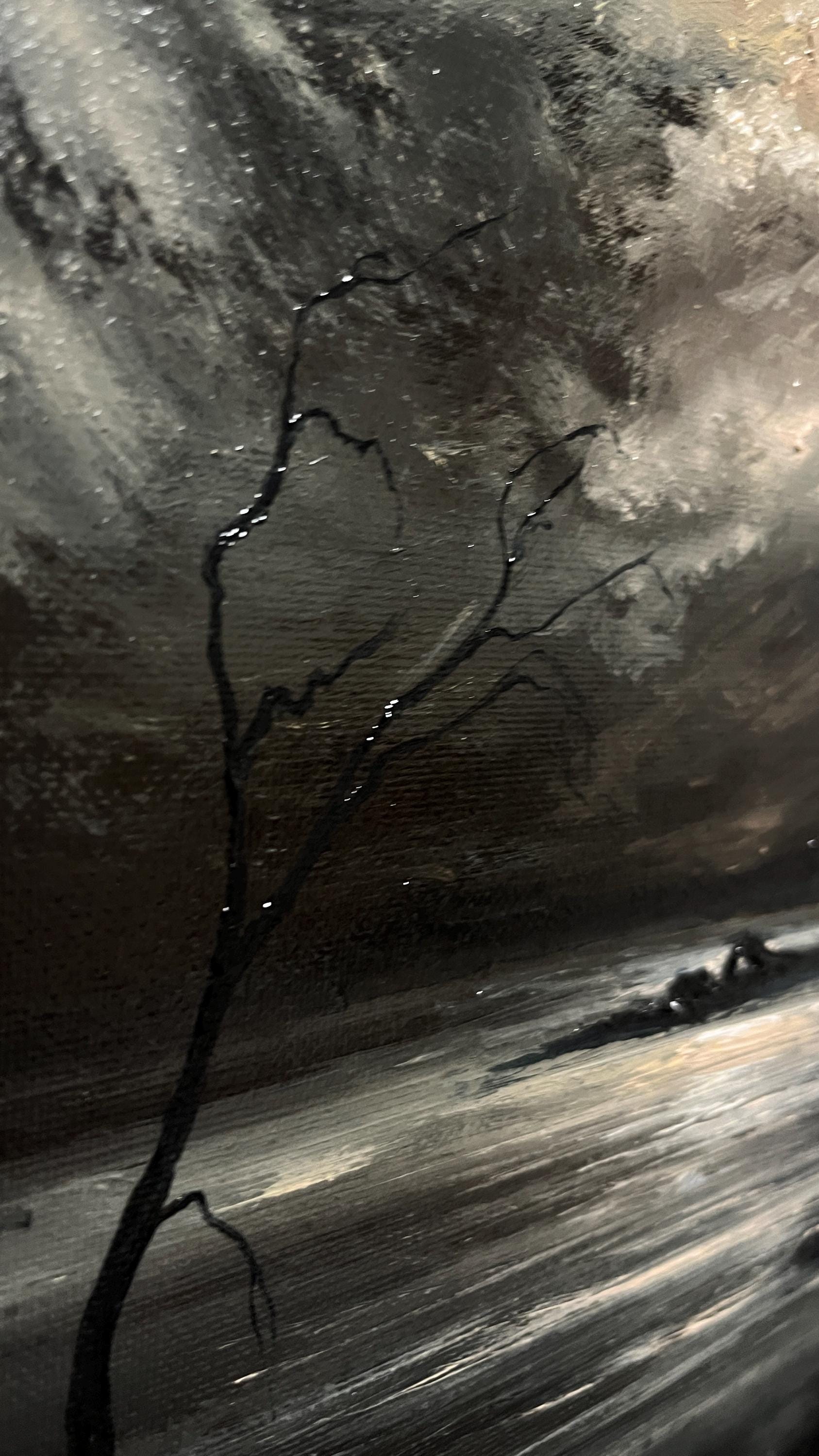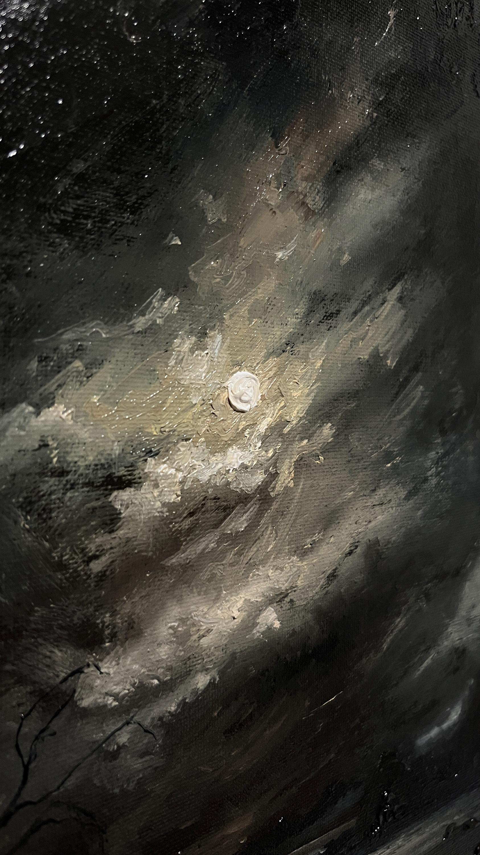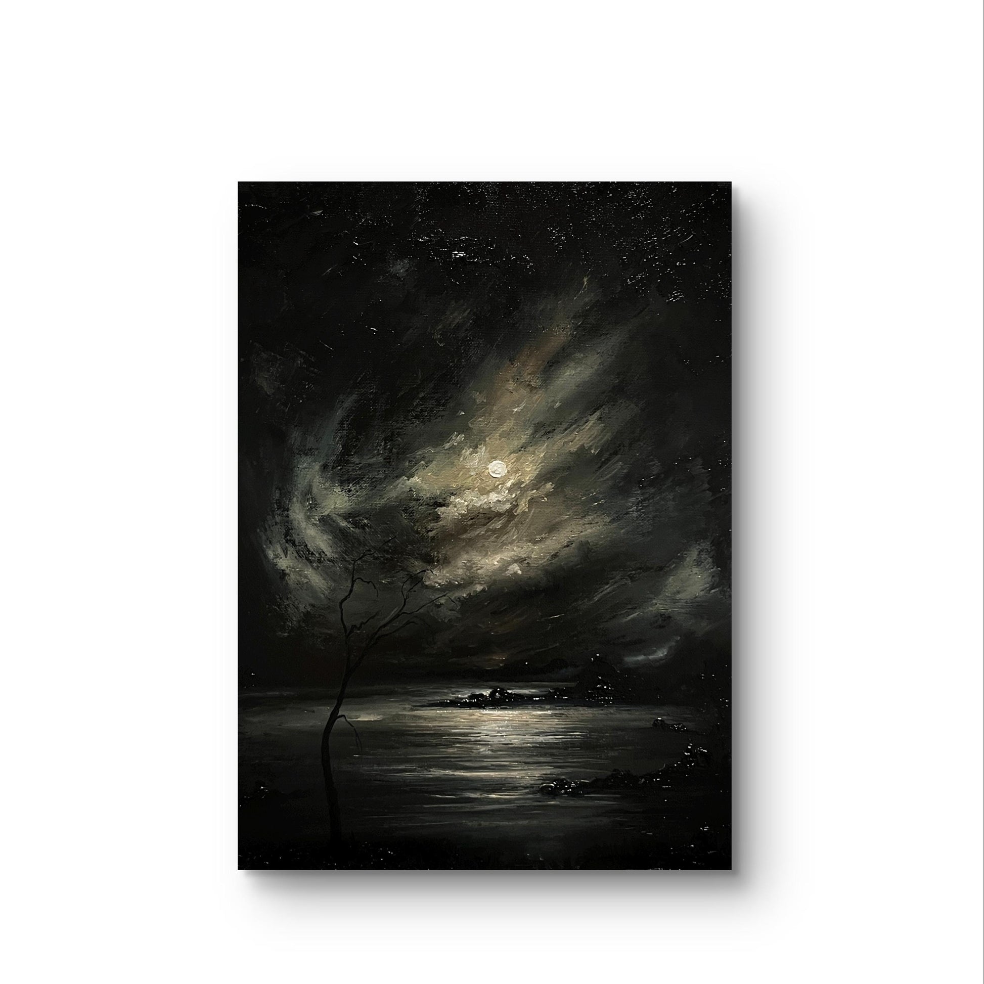 Experience the enchantment of the night with this original oil painting, depicting the moon shining through swirling clouds over a dark, reflective sea. This 12 × 16 inch (30 × 40 cm) artwork features textured impasto created with brush and palette knife techniques. Blending romanticism, dark academia, and atmospheric seascape styles, it showcases deep midnight blues, turquoise glows, and silvery moonlight. The piece captures the serene yet dramatic beauty of a moonlit ocean, inviting a peaceful and contemplative mood. Signed by the artist and accompanied by a certificate of authenticity, it arrives carefully packaged for secure international delivery. Please note it is sold unframed.