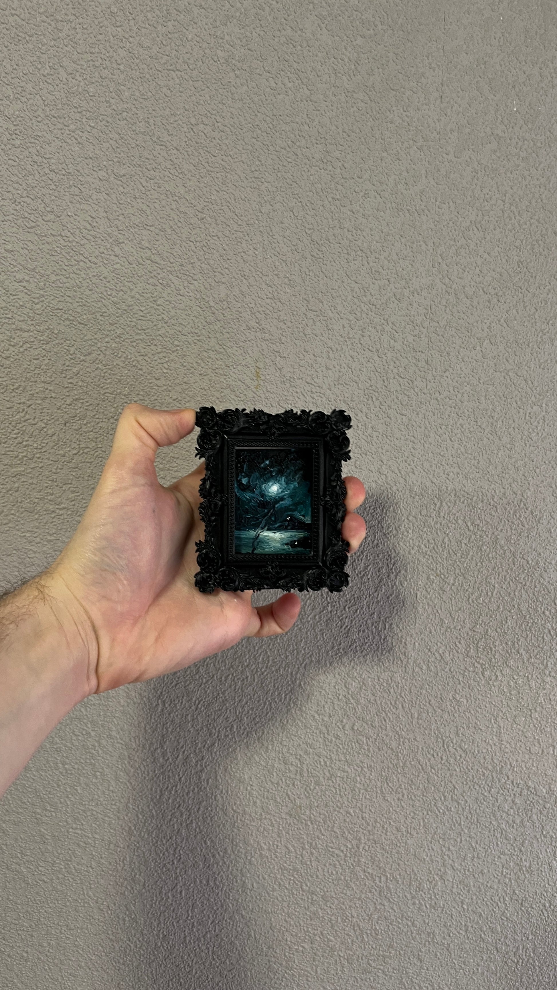 This miniature painting feels like a moment from a forgotten gothic novel — a quiet place where the world stops and the night breathes in deep shades of green and blue.
