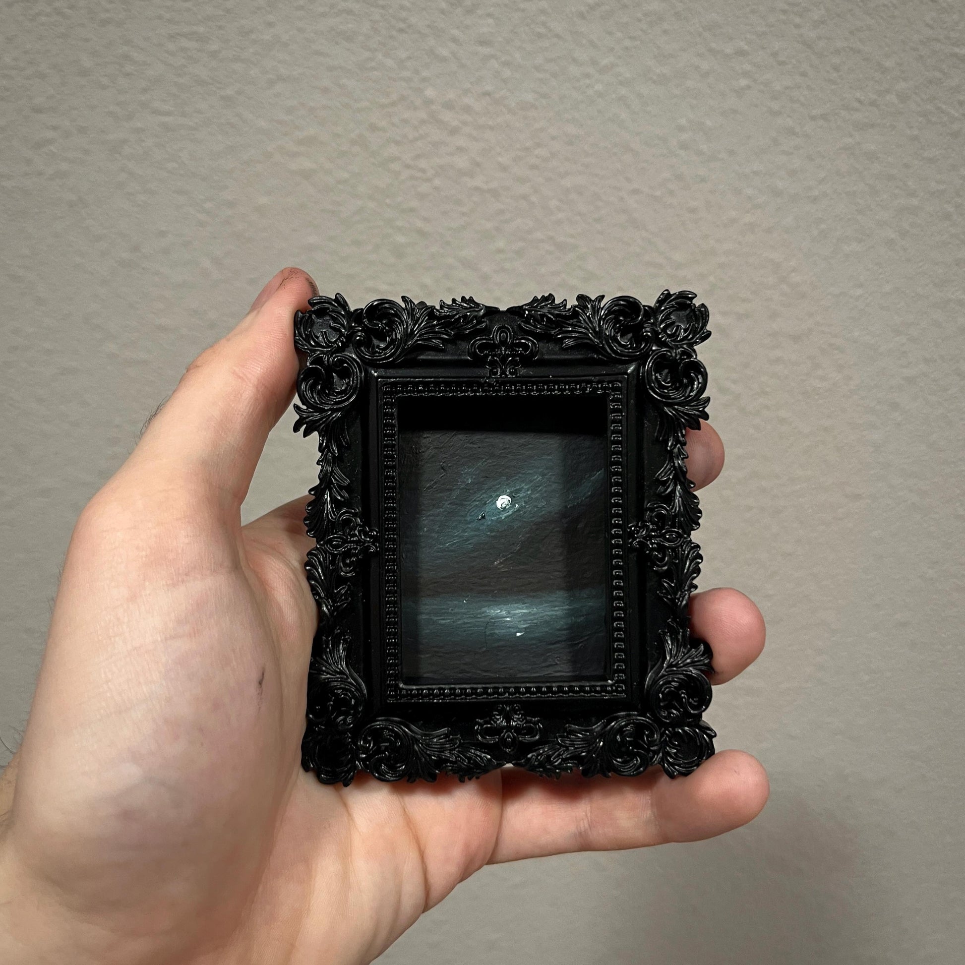 This original miniature oil painting, Silent Eclipse, features a glowing moon over dark waves, framed in a gothic black frame. Perfect for starting a private art collection, it brings a calm, timeless beauty to any space. Free shipping included.