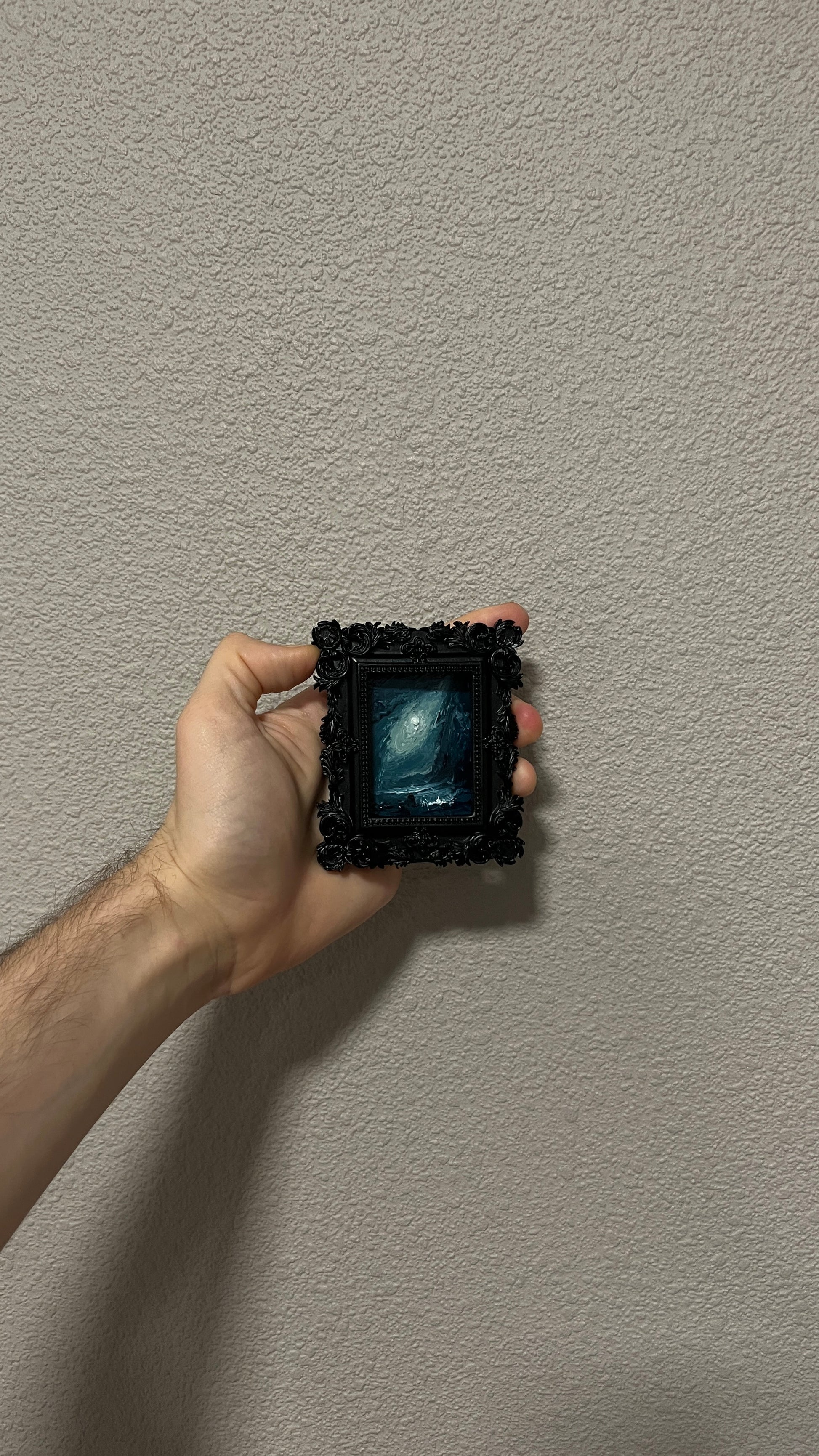 This hand-painted miniature is framed in an ornate black baroque frame, turning it into a pocket-sized gothic treasure. Perfect for collectors of dark academia décor, fantasy worlds, ghostly atmospheres, and moody nightscapes.