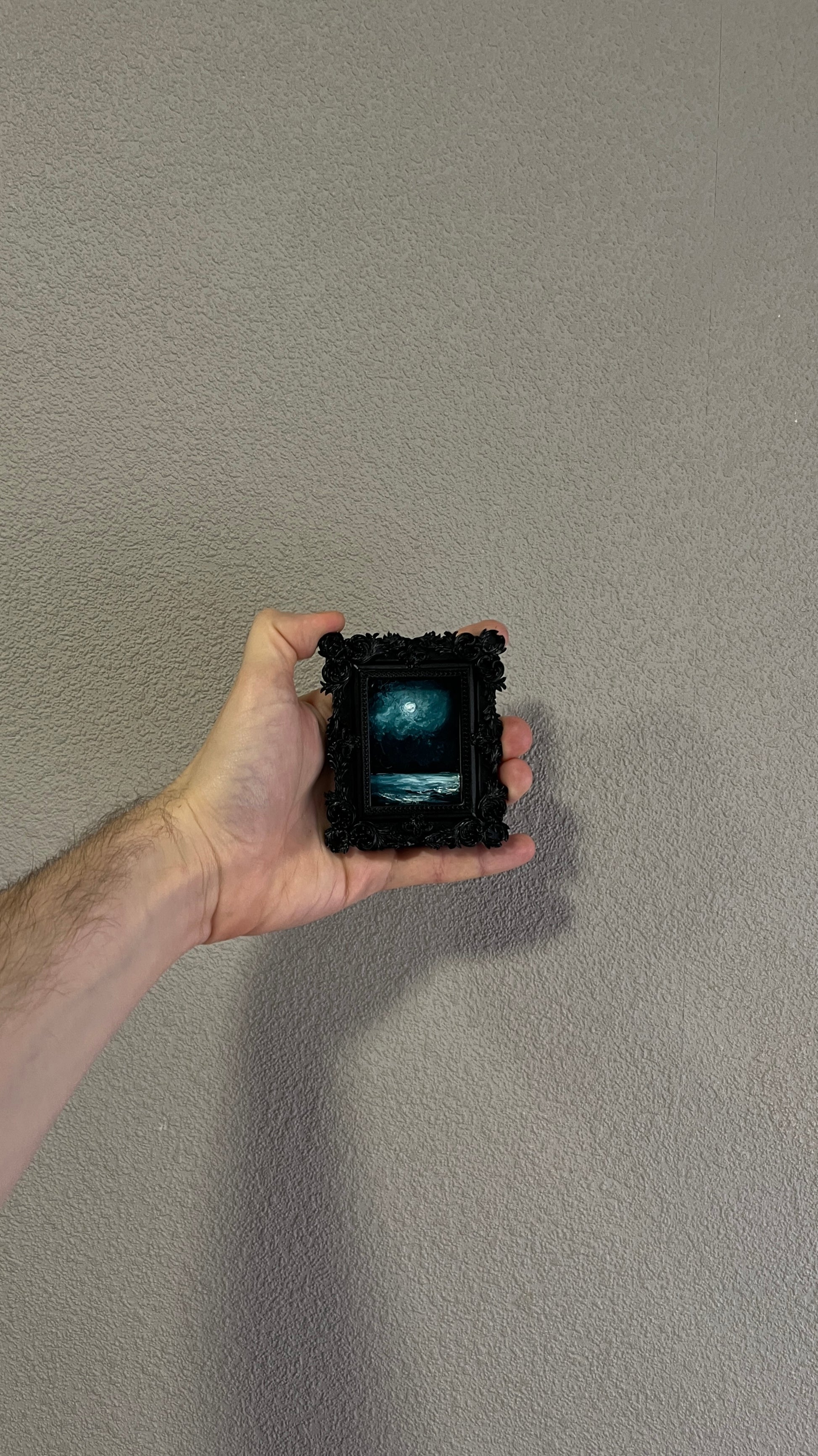 Painted with sculptural texture, every brushstroke catches the light differently, giving the water a subtle shimmer and the sky a soft, glowing depth. Set inside an ornate gothic black frame, it becomes a pocket-sized window into a moody alternate world.