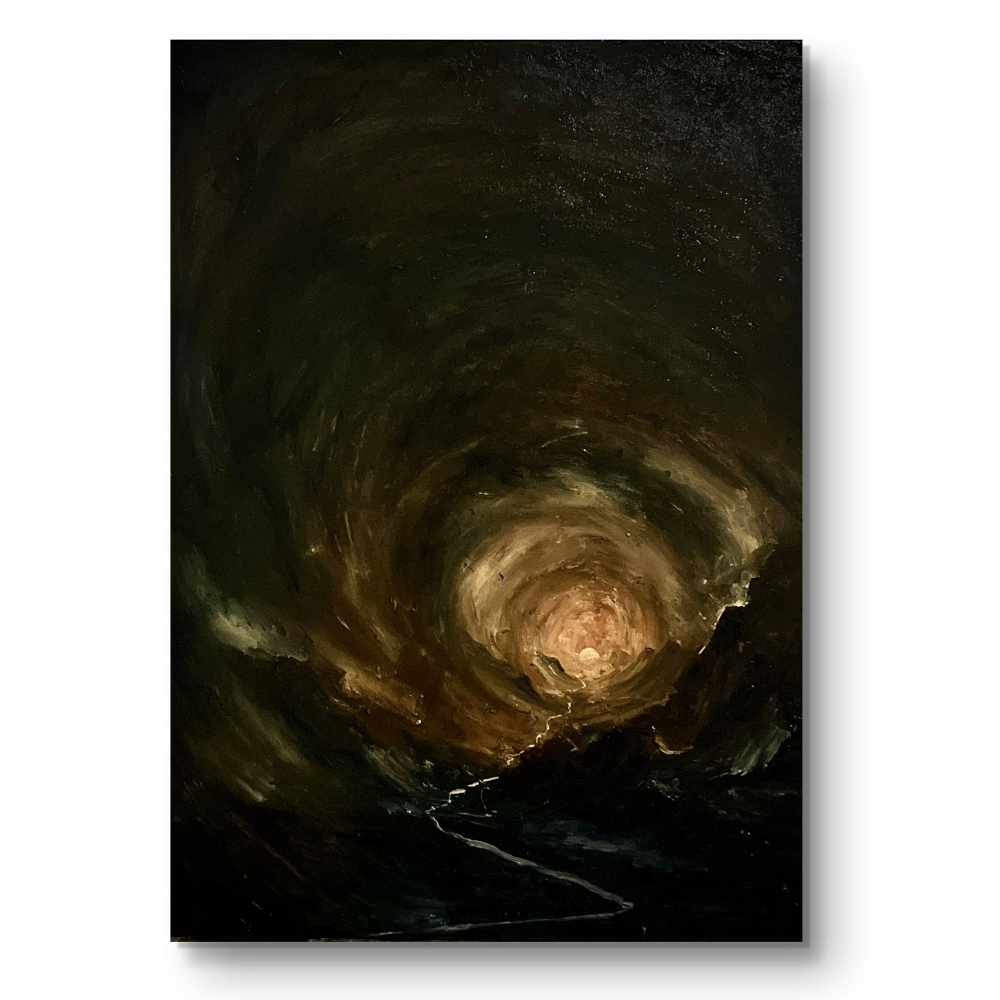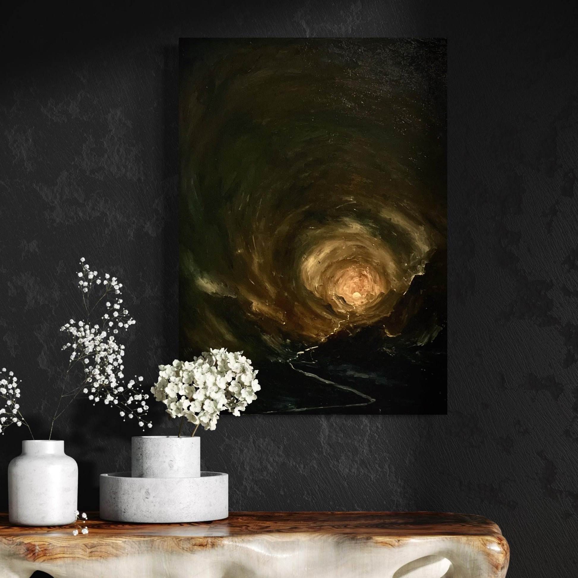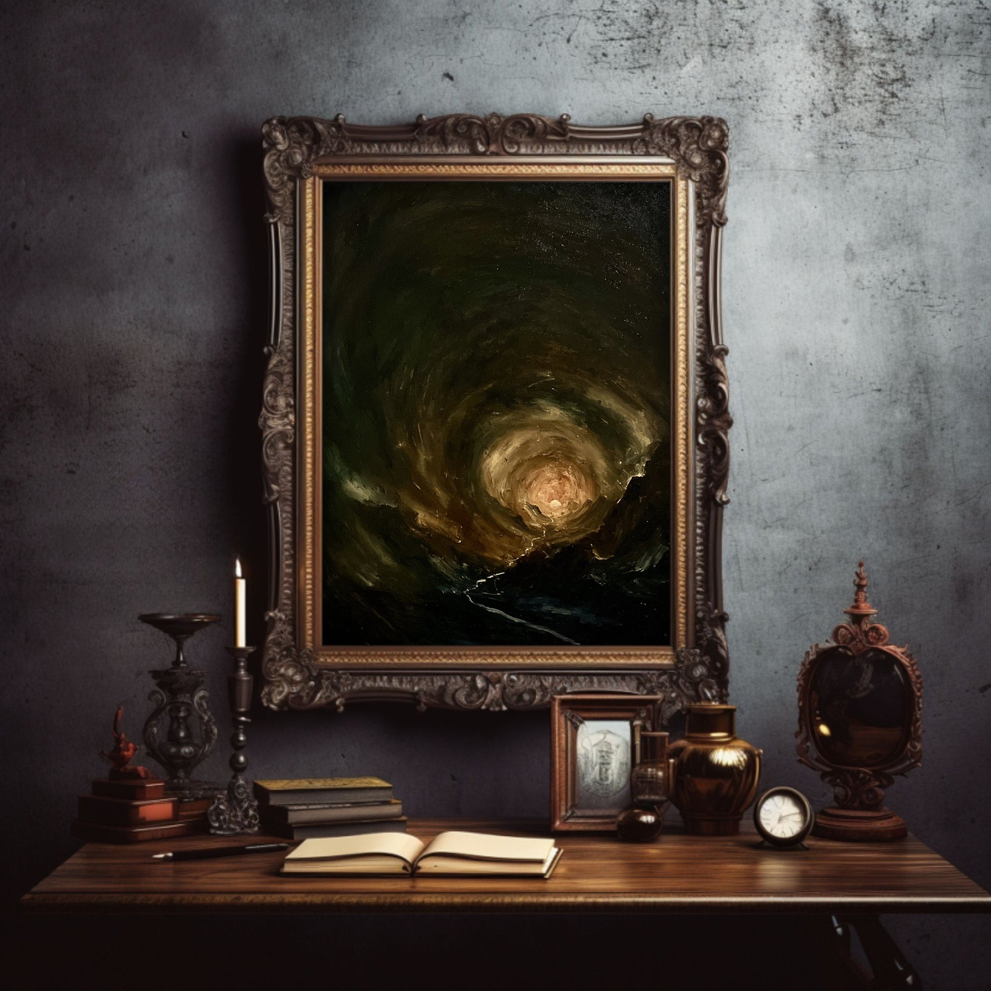 "Sunrise on the Valley" is a 24x32 inch original oil painting that captures a mysterious valley at dawn. Painted in a gothic and dark academia style with Victorian influences, it features a solitary mountain peak, swirling clouds, and a misty river reflecting golden sunrise light. This unique artwork adds dark elegance and atmospheric charm to any space, perfect for lovers of moody, dramatic decor. Handcrafted with premium oil paints on canvas and ready to hang, it offers a timeless, evocative touch to your home.