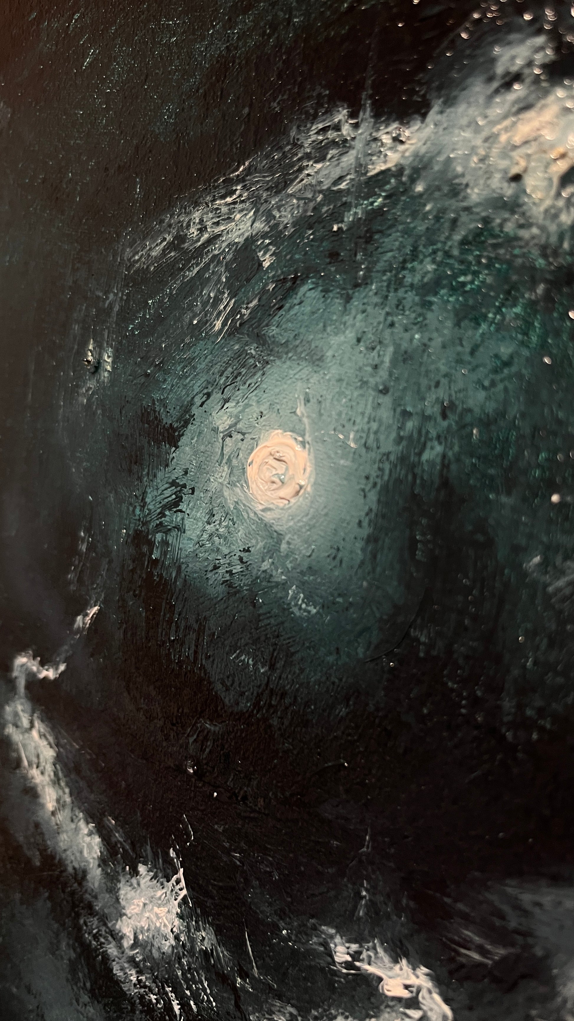 Immerse yourself in the mystery of the night with this original oil painting, capturing the moon glowing through swirling clouds above a dark, reflective sea.