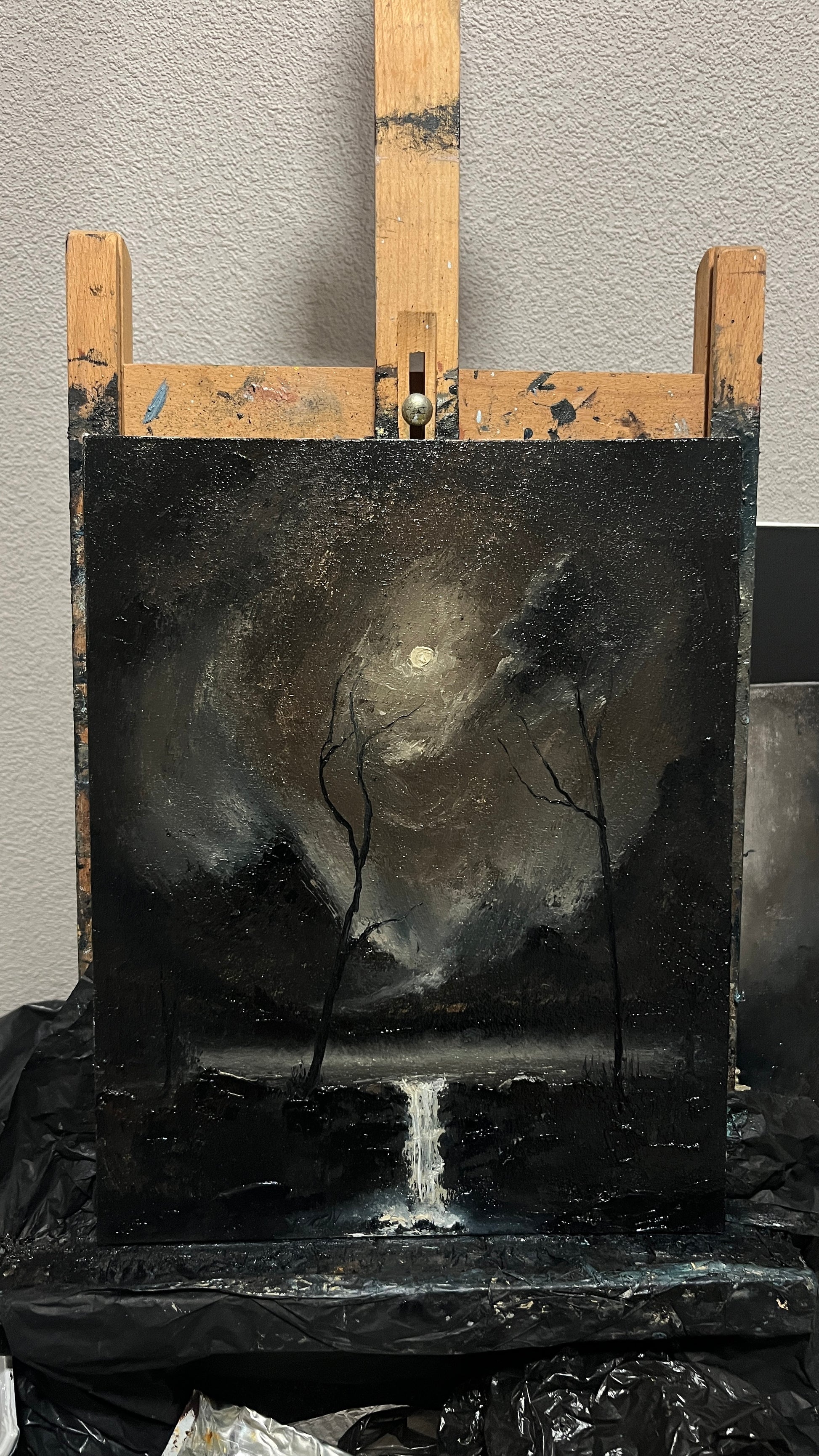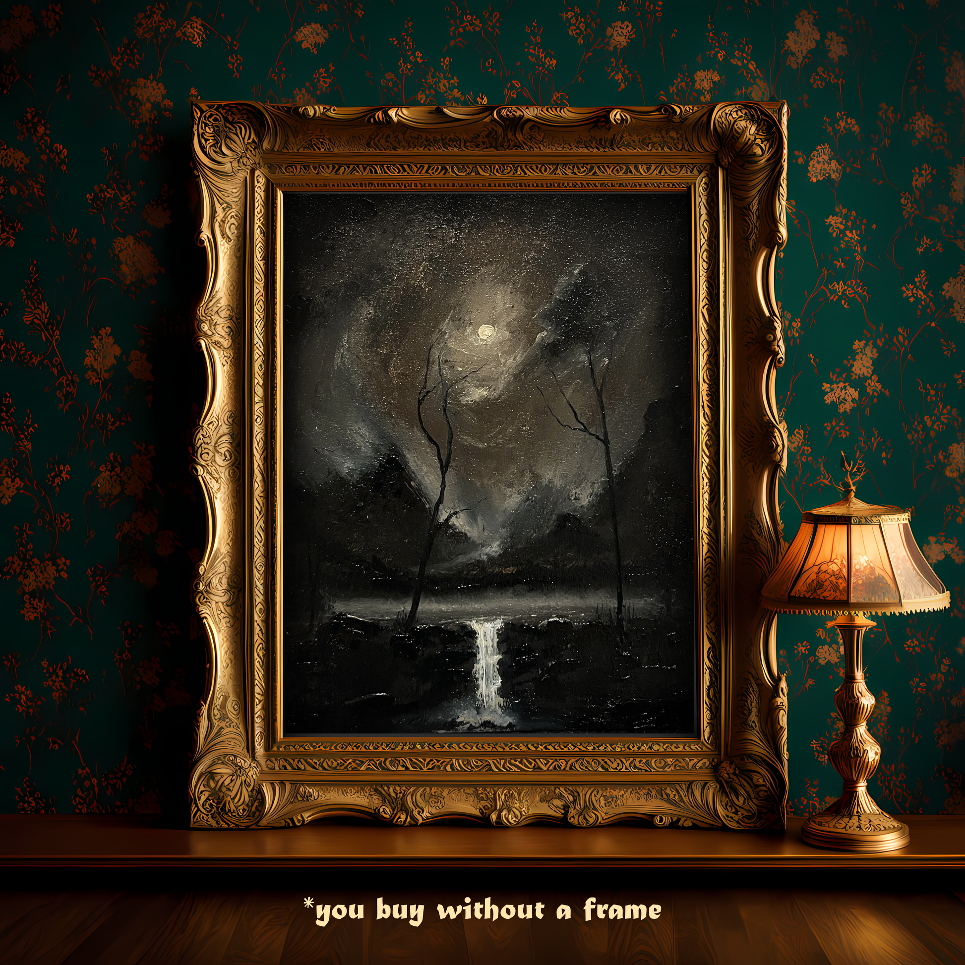 Under the pale glow of the moon, a waterfall cuts through the darkness in The Weeping Cascade. Two barren trees frame the nocturnal scene, while swirling clouds and silver light evoke a world of haunting solitude. This 24 × 30 cm (9.4 × 12 in) oil painting blends motion and stillness, embodying gothic romanticism at its core.